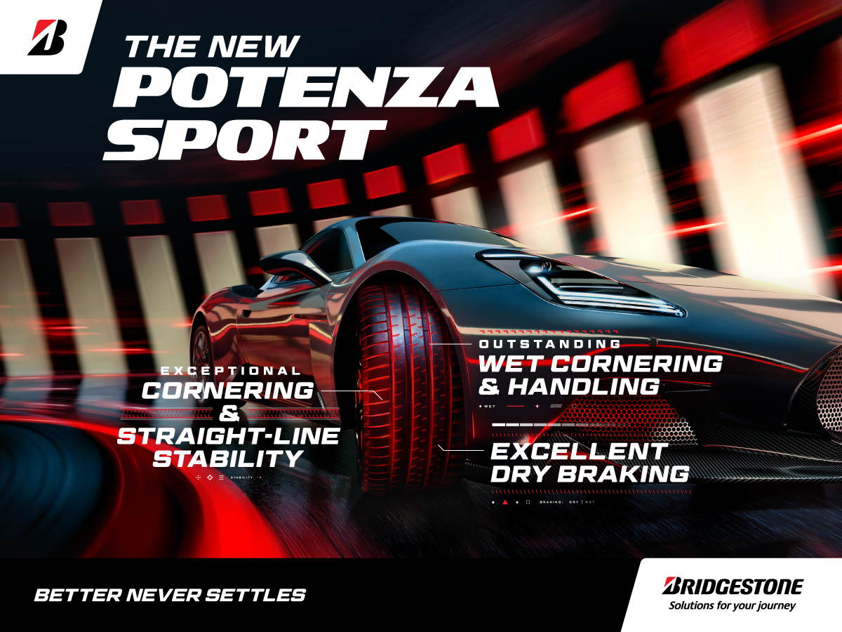 POTENZA Sport fits rims from 18" to 19" and 30 to 45 tyre profile series. Available now at all Bridgestone Authorised Dealers.
